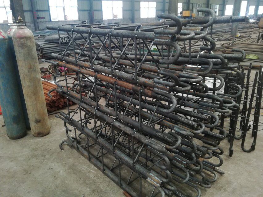 在建造行业中,地脚螺栓主要是用来固定没有强烈振动和冲击的设备,地脚螺栓的形式图1。地脚螺栓可以有效增加与基础的摩擦力,防止螺栓发生拔出破坏。对于使设备安装来说,一般的方法是,先将地脚螺栓定位,然后使用水泥将地脚螺栓浇注在水泥中,混凝土凝固后,将设备放置在地脚螺栓上,如图2,最后完成固定。对于单支撑的设备,上面的方法安装相对简单。但是如对于多支撑的设备, 现场安装将非常困难,具体的困难如下: